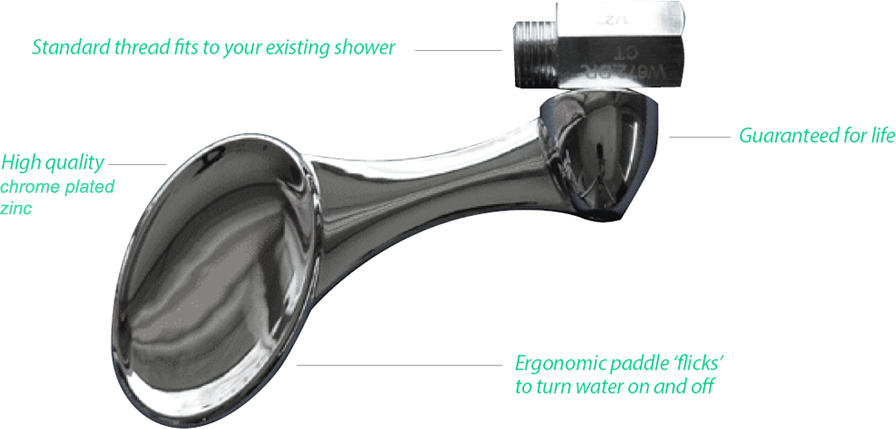 The Every Drop Shower Saver® is a paddle-like device inserted at the base of your existing shower head to save energy while KEEPING your favourite showerhead. After pausing the water, one flick of the EDSS brings it back ON at the SAME TEMPERATURE & PRESSURE (at a fraction of the price of a mixer tap). Installation is easy – DIY in 10 minutes. No plumber required to install it. Find the installation